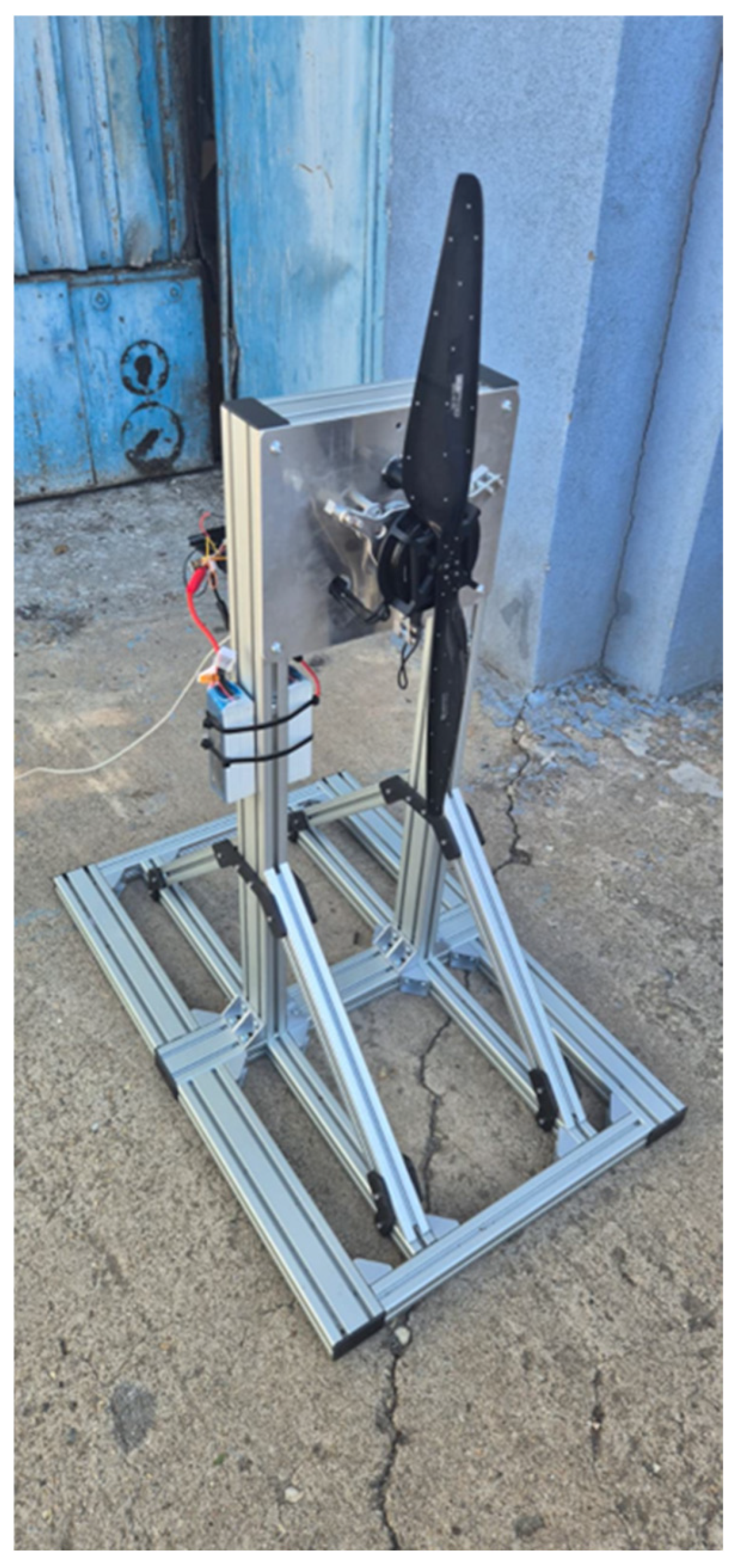 - Test bench design and validation—The stand was developed through an iterative design process, ensuring structural stability and measurement accuracy. Its modular architecture enabled reliable acquisition of thrust, torque, and rotational speed, establishing a robust platform for UAV propulsion research.
