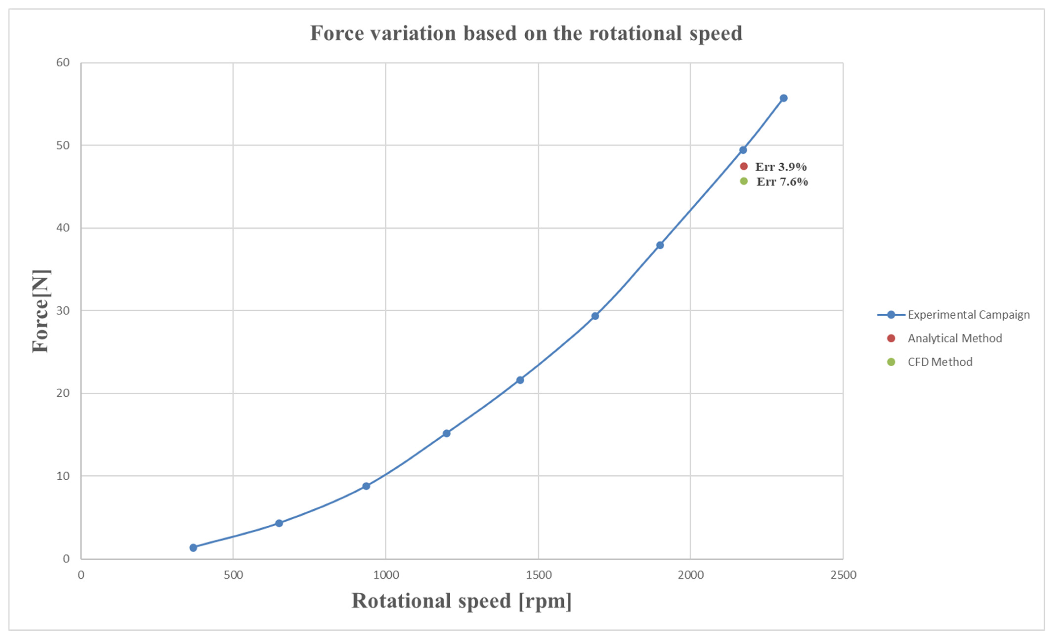 - When compared at the reference speed of ~2170 rpm, the analytically corrected method showed an error of only 3.9% relative to the experimental campaign, while CFD predictions deviated by 7.6%. This validates the analytical refinement as a reliable predictive tool and confirms the overall consistency of the three methodologies.