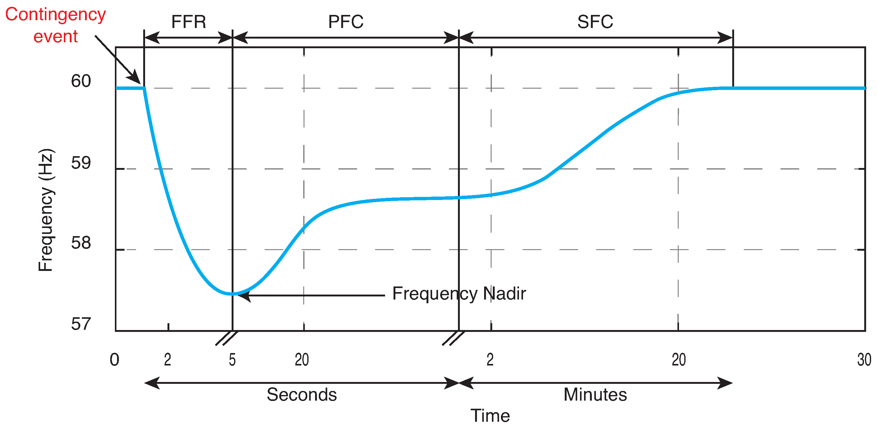 11] and is known as the inertial response. Inertial response is part of a broader concept called fast frequency response (FFR), designed to prevent frequency decay, reduce the initial rate of change, and increase the lowest frequency value, often called the frequency nadir [