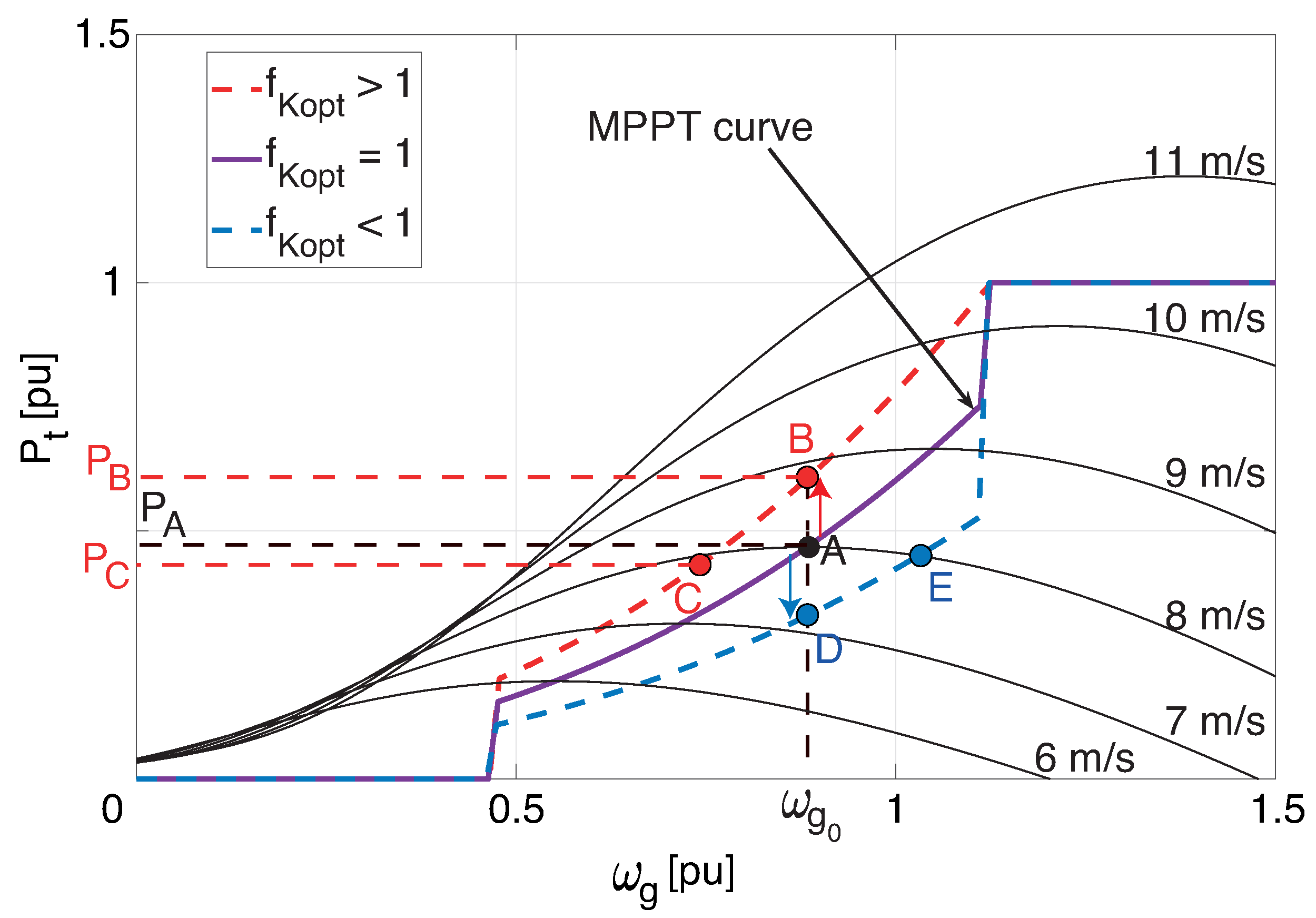 , which dynamically shifts the MPPT curve in response to grid frequency disturbances. The new reference value for the wind turbine power is defined by the variable