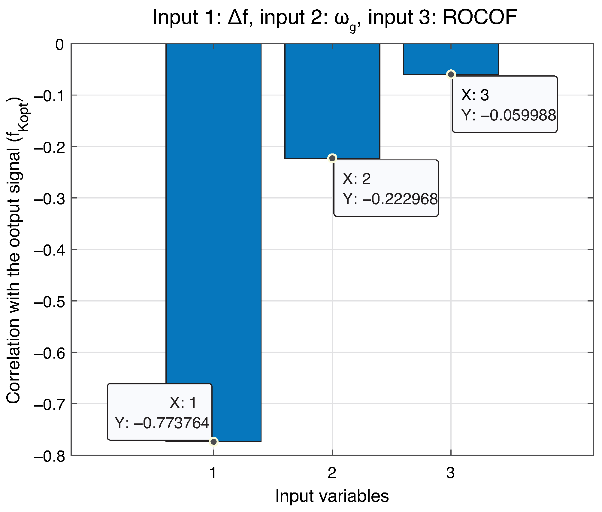 , namely the frequency deviation, the rate of change of frequency (ROCOF), and the rotational speed of the wind turbine. Based on this formulation, a correlation matrix was constructed to identify suitable input candidates. In this study, data were obtained from a series of simulations conducted on a power system under dynamic conditions and a WECS with OPPTE. To generate the dataset, variations in wind speed were considered, ranging from 5 m/s to 10 m/s, allowing for analysis of the system’s behavior under different wind resource levels. Additionally, disturbances in the electrical system’s demand were introduced, consisting of increases of +5%, +10%, and +15% relative to the nominal load. These operating scenarios generate a representative dataset that captures the interaction between the control signal and the OPPTE controller inputs, ensuring that the analysis reflects a diverse range of power system conditions.