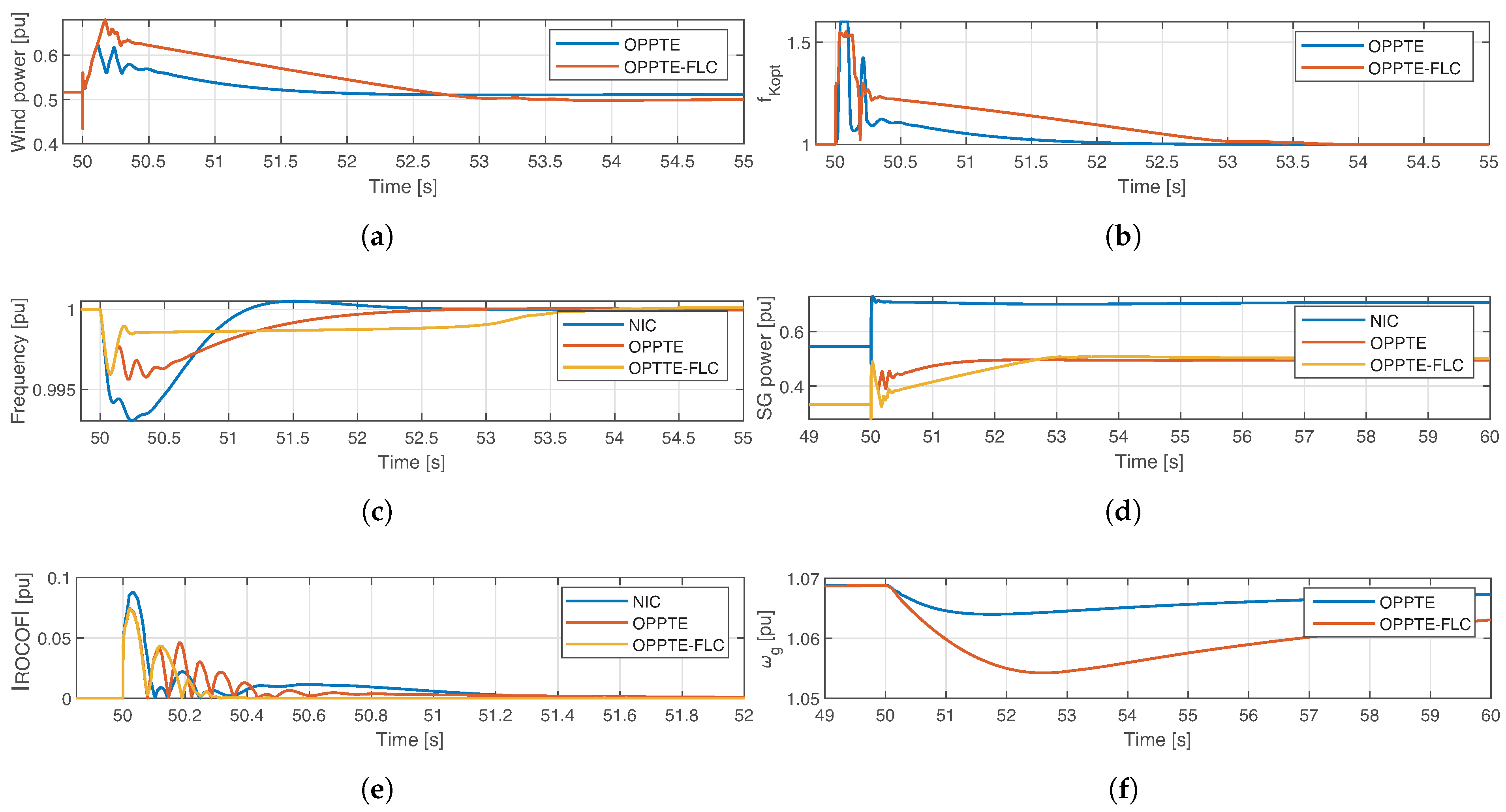 Figure 9e shows that the proposed FLC-based inertial control reduces the oscillations presented in the absolute value of the ROCOF compared to the OPPTE method. As a consequence of delivering additional active power, the rotor of the WECS experiences a slightly greater deceleration, as depicted in