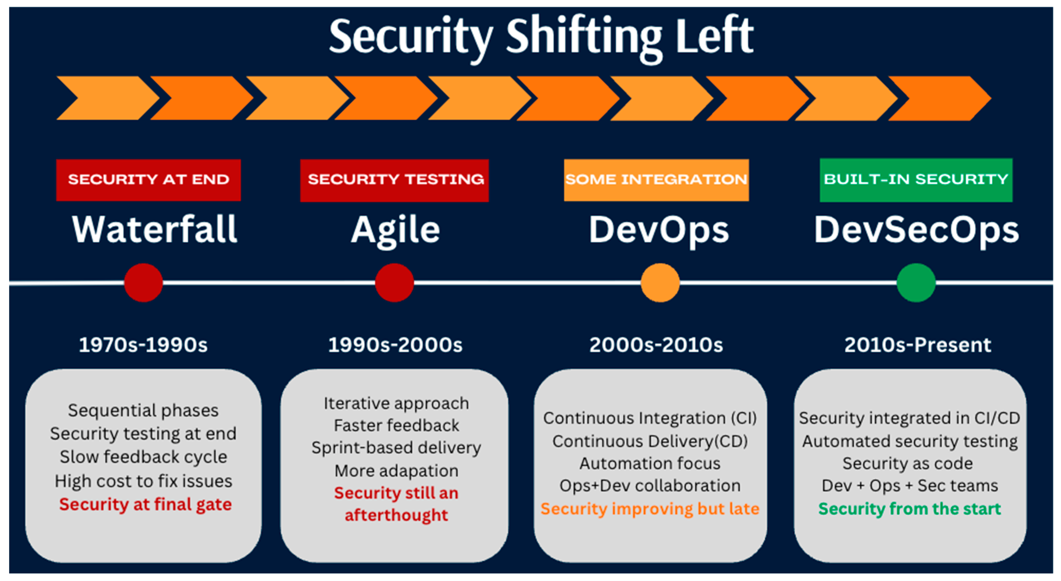 The evolution of DevSecOps marks a transformative shift in software development, embedding security into every phase of the software development lifecycle. This approach responds to the increasing complexity of modern software systems by prioritising early and continuous incorporation of security measures. DevSecOps is strategically significant for overcoming the limitations of traditional security practices, enabling organisations to achieve faster delivery cycles without compromising on security. Central to this paradigm is the “shift-left” principle, which emphasises the early identification and mitigation of security risks during development. By integrating automated tools such as SAST and DAST into CI/CD pipelines, shift-left practices enhance both development efficiency and security. However, persistent challenges remain, including skill gaps, cultural resistance, and the complexity of integrating diverse security tools. Successfully scaling shift-left security requires organisations to foster collaboration among development, security, and operations teams.