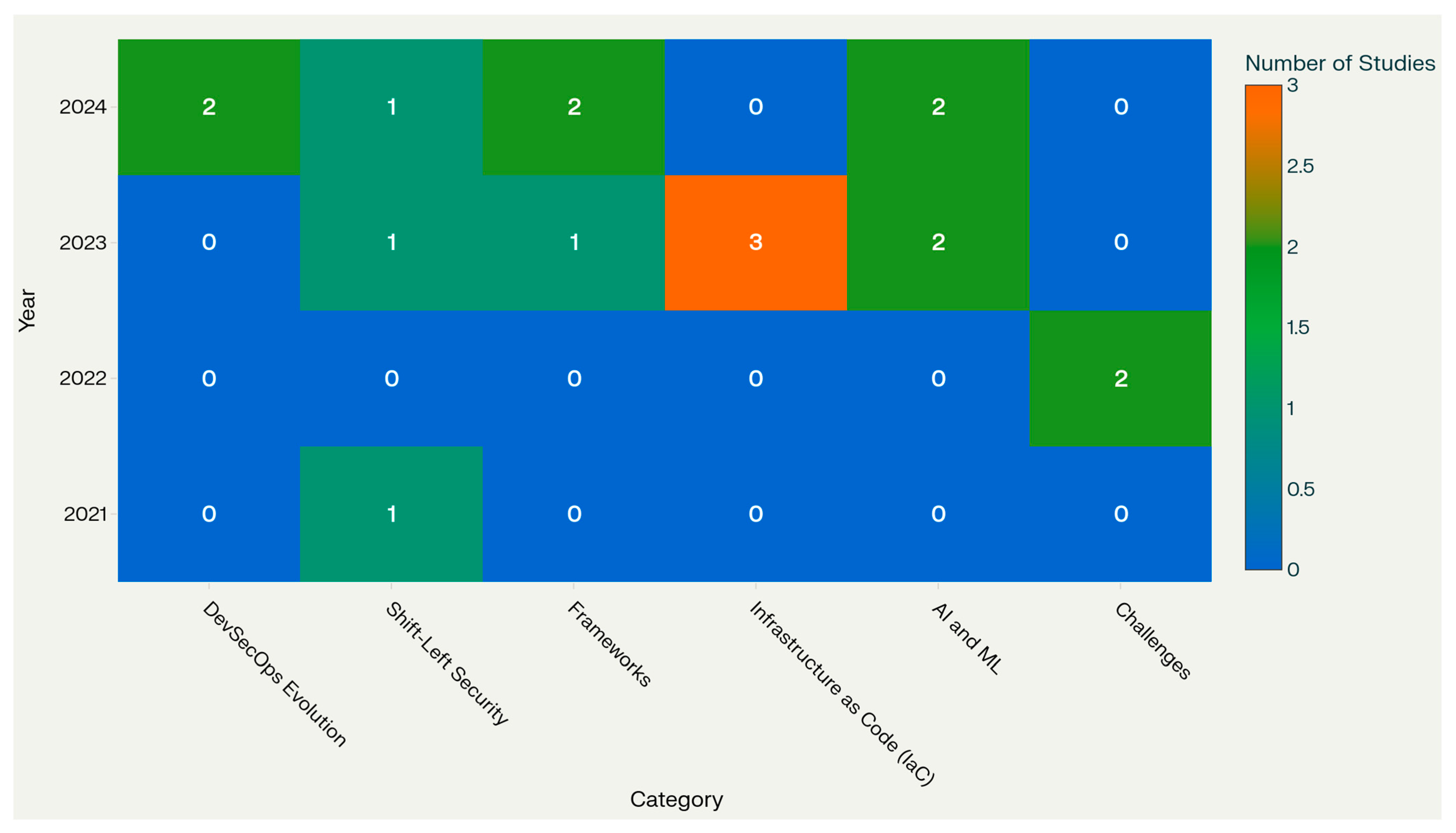 Figure 6 shows the heat map analysis reveals DevSecOps research as a rapidly evolving field characterised by distinct temporal phases and categorical specialisations. The visualisation demonstrates clear progression from foundational challenge identification in 2021–2022 toward advanced implementation strategies and emerging technology integration in 2023–2024. The uneven distribution across categories highlights both research strengths in areas like AI/ML integration and potential gaps in sustained Infrastructure as Code investigation. These patterns provide valuable guidance for researchers and practitioners seeking to identify emerging opportunities and underexplored domains within the DevSecOps landscape, ultimately contributing to more informed research prioritisation and resource allocation decisions. (Source: Heat Map generated using claude.ai)