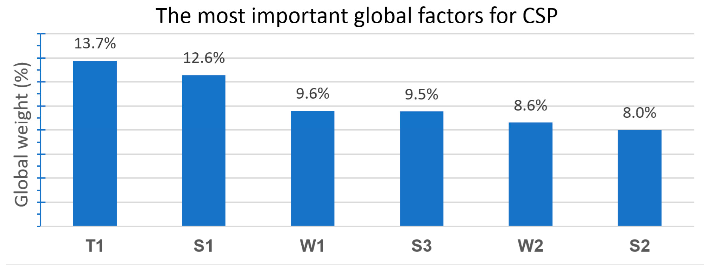Threats, assigned high global weight (24.26%) because they include competition from other clean technologies, market and regulatory uncertainties and, water scarcity problem. Recognising threats enables risk planning and the development of CSP system resilience. In risk management, understanding the global priorities of individual factors allows optimal allocation of resources to research and development, human resource training, financial instruments, and technical innovation.