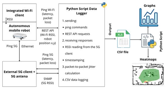 During the experiment, key connectivity quality indicators—namely latency, jitter, packet loss, and RSSI—were recorded in real time in parallel with the robot’s coordinates on the map. This approach enabled the subsequent creation of heatmaps that visualized the distribution of the measured parameters as a function of the robot’s location and movement. Data collection was carried out using a custom Python (v3.10) script that integrated multiple communication mechanisms. The entire data acquisition process is illustrated in Figure 3.