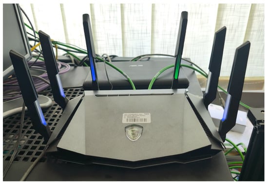 To ensure Wi-Fi connectivity during the experiment, a high-performance MSI RadiX AX6600 Wi-Fi 6 Tri-Band Gaming Router (Micro-Star International Co., Ltd., New Taipei City, Taiwan) was used, belonging to the category of modern Wi-Fi 6 devices. This router is designed for environments with high demands on throughput, low latency, and connection stability, which also makes it suitable for research applications in the field of mobile robotics. The device is equipped with six high-gain external antennas, providing strong and uniform coverage in the laboratory and adjacent areas. The router supports three frequency bands (2.4 GHz, 5 GHz, and 6 GHz), enabling efficient network distribution and minimization of interference []. A visual representation of the device is provided in Figure 5.