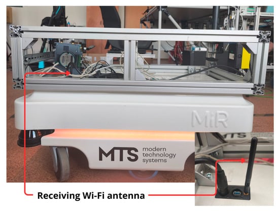 In the experiment, the router was configured to operate in the 2.4 GHz band, which provides better penetration through walls and obstacles compared to higher frequency bands. It was connected to the laboratory’s fixed Ethernet infrastructure and supplied wireless connectivity for the autonomous mobile robot MiR100. The placement of the receiving Wi-Fi antenna system on the robot is shown in Figure 6.