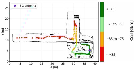 Latency and packet loss values were obtained using the ping command, while jitter was calculated from the recorded latency value. Robot position data and Wi-Fi RSSI were obtained via the REST API (version v2.0.0) a web interface that enables applications to communicate over the Internet using standard HTTP requests [], during communication with the robot, whereas 5G RSSI values were collected through the SNMP protocol (Simple Network Management Protocol—a simple protocol for managing network devices []) from the mobile client device SCALANCE MUM853-1 (Siemens AG, Munich, Germany).