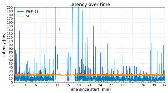 Although Wi-Fi 6E achieved a lower average latency (16.54 ms), it suffered from extreme peaks reaching up to 3120 ms, packet loss, and high sensitivity to robot orientation and distance from the access point. Such instability poses a risk for applications requiring consistent and predictable delays. In contrast, the 5G SA network maintained high consistency with an average latency of 19.38 ms and a maximum of 32 ms, confirming its suitability for real-time control.