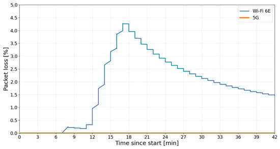 The jitter of Wi-Fi 6E reached extreme values of up to 3088 ms, while 5G remained highly stable, with an average jitter of 1.94 ms and a maximum of 13 ms, independent of the robot’s position or orientation. Packet loss for Wi-Fi (1.71%) indicated limited reliability under changing conditions, whereas 5G recorded 0% loss throughout the entire experiment—even in areas with high attenuation and reflections. Similarly, the RSSI analysis showed that 5G maintained a stable connection even at −111 dBm without degradation in latency or jitter, while Wi-Fi lost connectivity at around −81 dBm. A key finding of this study is that the quality and stability of autonomous robot control depend not only on the RSSI but primarily on the temporal variability of network parameters—namely latency, jitter, and packet loss. The experiments revealed that even with weaker signal levels, 5G was able to maintain a stable data flow with consistent reaction times, fundamentally changing how network performance should be assessed in industrial applications.