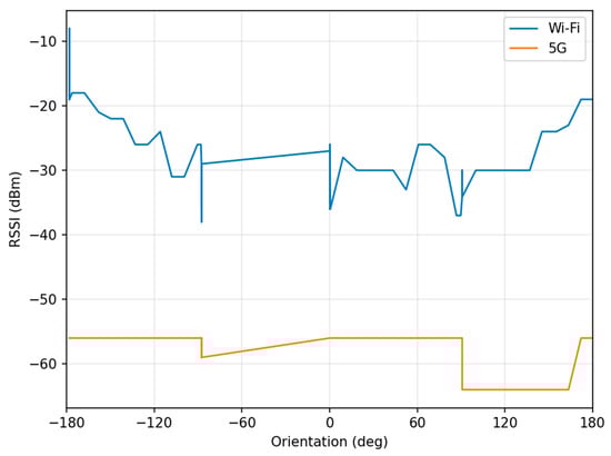 The Wi-Fi RSSI varies in the range of −20 to −40 dBm, with instabilities clearly associated with changes in the robot’s orientation. Significant decreases occur when the robot loses the optimal alignment of the antenna with respect to the source. In contrast, the 5G RSSI remains relatively stable between −55 and −65 dBm, with only minor variations during orientation changes.