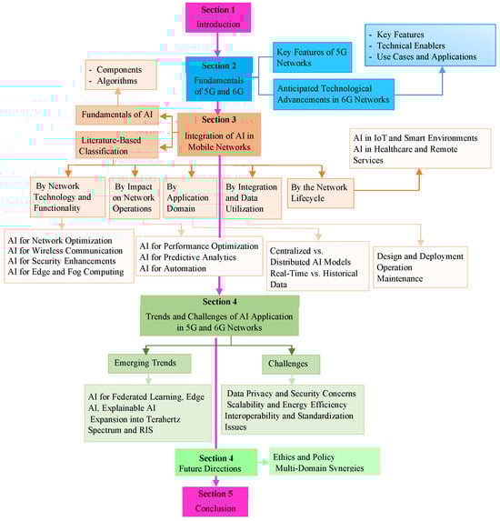 The structure of this article is as follows: Section 2 details the key concepts of 5G and 6G networks, Section 2.2.3 examines the incorporation of AI into these infrastructures through an in-depth classification, while Section 4 highlights the recent developments, challenges and future prospects of this technological fusion. Figure 1 illustrates the complete visual structure of our paper.
