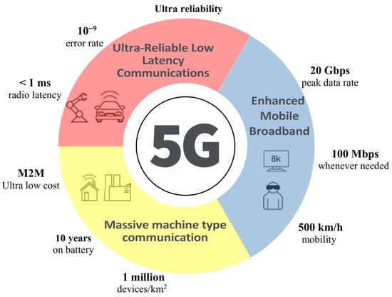 Today, several studies recognise that the next step in the evolution of telecommunications worldwide is 5G mobile access technology, which is expected to cover a wide spectrum of applications such as IoT, smart city management, healthcare services, virtual reality and entertainment [20,21,22]. A series of functionalities and requirements have been implemented in the 5G network. The main goals are related to high bit rate, low latency, high density allowing for a large number of devices per km2 and high spectral efficiency.