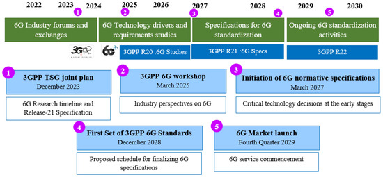 The development of 6G networks is a complex endeavor that encompasses standardization, industrial projects, and infrastructure deployment. These aspects are crucial to harnessing the full potential of 6G in transforming mobile communication systems. In these initiatives, the International Telecommunication Union (ITU) and other global organizations play a central role, with the goal of publishing international standards before 2030. This process requires cross-sector collaboration to ensure that 6G meets the diverse needs of future digital societies. In the following, we discuss the key elements of 6G standardization, industrial initiatives, and reference frameworks. The International Telecommunication Union (ITU) is leading the standardization initiatives for 6G, with the IMT-2030 framework serving as the central component. This framework outlines the technological evolutions and future requirements for terrestrial IMT systems toward 2030 and beyond [37]. Figure 3 summarizes the key milestones and timeline for 6G standardization. Table 2 provides an overview of the key 6G technologies and their benefits, showing how 6G is expected to enhance performance across multiple dimensions and deliver significant value.