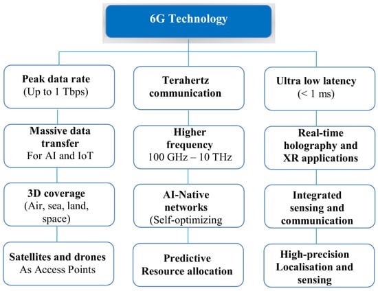6G networks will be very different from previous generations of communications networks. They are characterised by key features such as ultra-reliable, low-latency communications, throughput improvements of tens of gigabits per second, increased energy efficiency for long battery life, the ability for a trillion devices to meet IoT requirements, support for diverse types of communication, scalability and adaptability to dynamically changing application requirements, resilience to security attacks and privacy protection. Finally, they have the ability to adapt quickly to new trends. To realise these key differentiating characteristics, 6G networks would require fundamental reform of existing technologies, regulatory frameworks and lifestyles [39]. Figure 4 summarises the fundamental characteristics of 6G technology.