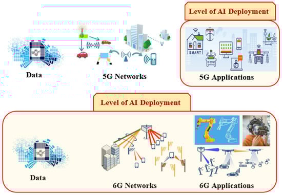 Building on the discussion of AI fundamentals, recent advances in artificial intelligence for 5G and 6G networks have further reshaped the way networks operate, enabling real-time decision-making, predictive resource allocation, and efficient deployment on edge devices. Innovations in neural network architectures, such as Transformer models, now support traffic prediction, allowing for proactive management of network resources [71]. Lightweight models like MobileNet and TinyML facilitate AI execution directly on edge devices, ensuring low latency and high efficiency in processing data locally [72]. Reinforcement learning algorithms, exemplified by the PRAXIS framework, enhance traffic optimization in URLLC, improving network reliability and responsiveness [73]. Moreover, AI-driven capabilities enable dynamic spectrum control and predictive resource management, maximizing network performance and user experience [74]. These developments illustrate the transition from the more centralized AI applications of 5G, which primarily focus on optimization and support, to the pervasive and autonomous AI-driven paradigm envisioned for 6G, where distributed, collaborative models allow networks to anticipate, adapt, and manage operations in ultra-dense and heterogeneous environments, supporting advanced services such as holographic communications and massive intelligent environments [72]. Table 4 summarizes how AI is applied across different dimensions of 5G and 6G networks, showing its growing role in optimization, automation, edge intelligence, and privacy-aware frameworks. Figure 6 shows an illustration of the role of AI in 5G and 6G Networks.