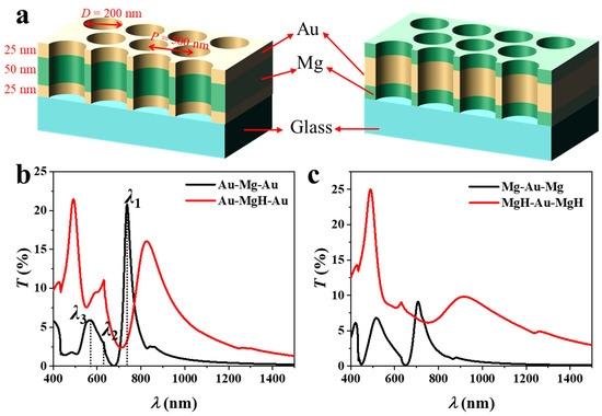 The following supporting information can be downloaded at: https://www.mdpi.com/article/10.3390/technologies13120564/s1, Figure S1. (a) Simulation configuration and (b) Transmission spectra of the nanohole arrays with different polarization angles. The polarization angle in (a) was defined as 0°; Figure S2. (a) Transmission spectra of Au (25 nm)-Mg (50 nm)-Au (25 nm) arrays with different diameters. (b) Transmission spectra of Au-Mg-Au arrays (diameter = 240 nm) with different Au:Mg:Au ratios.