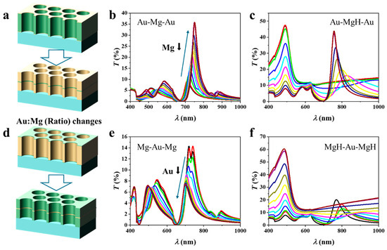 Three-layer nanohole arrays with a fixed total thickness of 100 nm but varying Au/Mg ratios. (a–c) Au–Mg–Au structures with decreasing Mg thickness show characteristic EOT spectra before hydrogenation and composition-dependent redshifts after hydrogenation, strongest in Mg-rich samples. (d–f) Mg–Au–Mg structures with decreasing Au thickness similarly reveal pronounced hydrogen-induced spectral shifts in Mg-rich configurations.