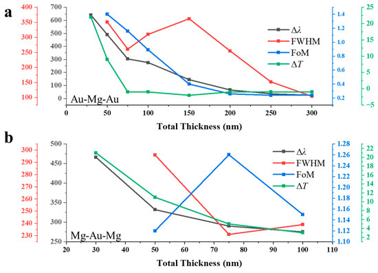 Hydrogen sensing performance of three-layer nanohole arrays as a function of total thickness: (a) Au–Mg–Au structures (15:70:15 ratio) showing resonance shift (Δλ), linewidth (FWHM), figure of merit (FoM), and peak transmission change (ΔT) extracted from Figure 4b,c. (b) Mg–Au–Mg structures (3:4:3 ratio) displaying the corresponding sensing parameters derived from Figure 4e,f.