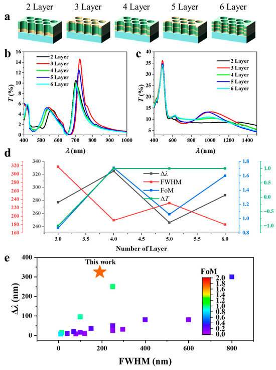 Optical response and hydrogen sensing performance of Mg–Au–Mg multilayer nanohole arrays with fixed total thickness of 100 nm and varied stacking sequences: (a) Schematics of two- to six-layer configurations (Au–Mg, Au–Mg–Au, Au–Mg–Au–Mg, Au–Mg–Au–Mg–Au, and Au–Mg–Au–Mg–Au–Mg) designed with the optimal Mg:Au:Mg ratio of 30:40:30 nm. (b) Transmission spectra before hydrogenation showing odd–even dependence of the dominant EOT resonance. (c) Transmission spectra after hydrogen exposure, exhibiting strong modifications due to Mg converting into insulating MgH2. (d) Quantitative summary of the composition- and stacking-dependent spectral characteristics, including resonance shifts (Δλ), FWHM, FoM, and transmission changes (ΔT). (e) Plot of state-of-the-art plasmonic hydrogen sensors, plotting maximum Δλ, FWHM, and FoM. The FoM values are indicated by the color bar.