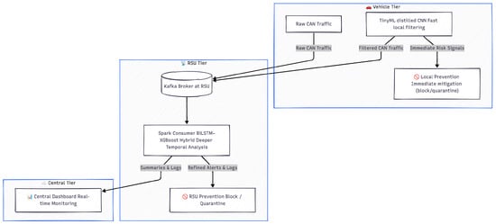 These challenges (tight real-time budgets, safety stakes, and resource constraints) require a new breed of lightweight, understandable, and high-speed Intrusion Detection and Prevention Systems (IDPS). Recent hybrid detection models combining deep learning (DL) and gradient boosting have shown promising results for securing vehicular environments [13]. Building on this insight, our framework adopts a hierarchical defense strategy: a TinyML-based distilled CNN on vehicles for ultra-fast on-device detection, a BiLSTM-XGBoost hybrid model at RSUs for deeper temporal–spatial analysis of traffic flows, and a centralized Kafka–Spark Streaming layer for city-wide monitoring, coordination, and adaptive model updates [14,15]. This tiered design balances immediacy, depth of analysis, and operational scalability under realistic smart intersection conditions.