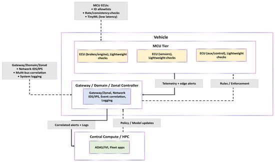 In deployed systems, heavier intrusion-detection tasks reside on gateway/zonal controllers due to network visibility and compute headroom [32,33]. MCU ECUs provide first-line, low-latency screening and can run TinyML-scale anomaly filters when millisecond response is required [34]. Alerts/summaries are forwarded to the gateway for system-level correlation and action.