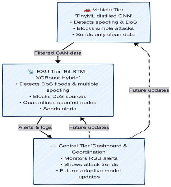 Likewise, blockchain-enabled IoV security [56,57] provides tamper-resistant logging and trust management, yet these systems often omit high-frequency IDS inference or do not operate on constrained OBUs. In contrast, the proposed H-RT-IDPS focuses on hierarchical, real-time detection with TinyML CNN student and RSU-tier BiLSTM-XGBoost inference—rather than distributed training or immutable logging. FL and blockchain therefore represent complementary directions for future integration, such as federated model aggregation for adaptive retraining and blockchain-backed auditability of RSU decisions.