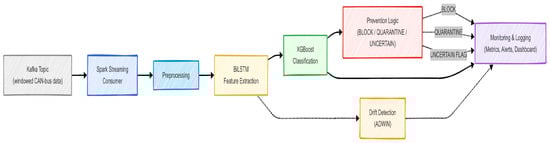 The authors of [19] proposed one of the few truly real-time IDS solutions using a Kappa Architecture. Their system combines Spark Streaming with ensemble learning models—Random Forest, XGBoost, and Decision Trees—to detect CAN bus attacks such as DoS, spoofing, fuzzing, and replay. Achieving up to 98.5% accuracy and low-latency detection (as fast as 0.26 s), the work demonstrates solid real-time processing capabilities. However, the system lacks attack prevention and operational monitoring, and its traffic simulation capabilities are restricted, which our framework addresses.