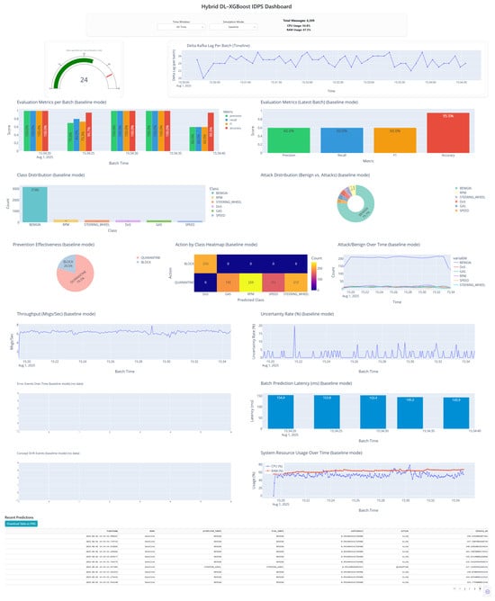 - A practical real-time dashboard integrated into the proposed Kafka–Spark IDPS pipeline, used to monitor detection outcomes, prevention actions, and system health, thereby supporting operator situational awareness in IoV environments.(Modules and data sources in Section 6.2.3; live operation in Section 7).