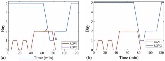 Typical RGV operation diagram (a) Operational conflict occurrence between dual RGVs; (b) operational conflict avoidance between dual RGVs. A and B represent the points at which conflicts occur between RGV1 and RGV2.