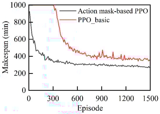 Figure 5 provides a demonstration of the iterative convergence characteristics between the action mask-based PPO algorithm and the conventional penalty-based PPO approach (PPO_basic). The results reveal several performance distinctions that underscore the advantage of the action masking methodology. The convergence velocity superiority of the action mask-based PPO algorithm is pronounced during the initial training phases. Within the first 300 episodes, the action mask-enabled agent achieved makespan reductions to below 400 min, indicating successful acquisition of fundamental scheduling strategies. In contrast, the PPO_basic approach required significantly more episodes to reach comparable performance levels, with makespan values exceeding 1000 min during the same amount of time. This performance differential can be attributed to the fundamental architecture of action masking. By constraining the agent’s decision space to feasible actions, the learning process circumvents the expensive phase of learning constraint violations and associated penalties.