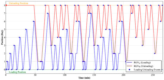Furthermore, the movement strategy reveals that during multiple time intervals, both RGVs demonstrate coordinated unidirectional movement patterns. This behavior can maximize transportation efficiency while maintaining safe inter-vehicle distances.
