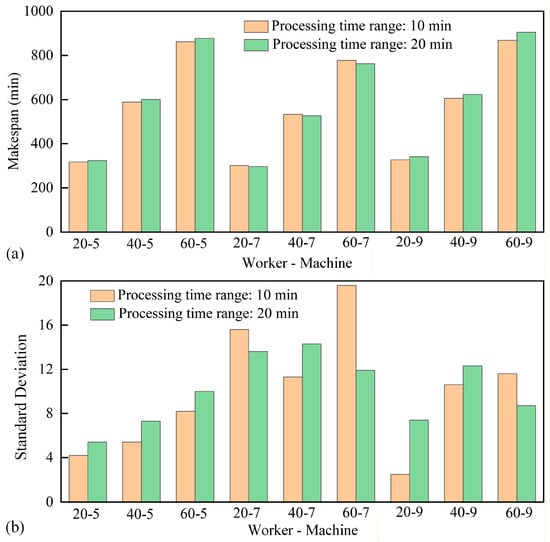 The change in the (a) average makespan and (b) standard deviation of the machining time span from 10 to 20 in the example in Table 2.