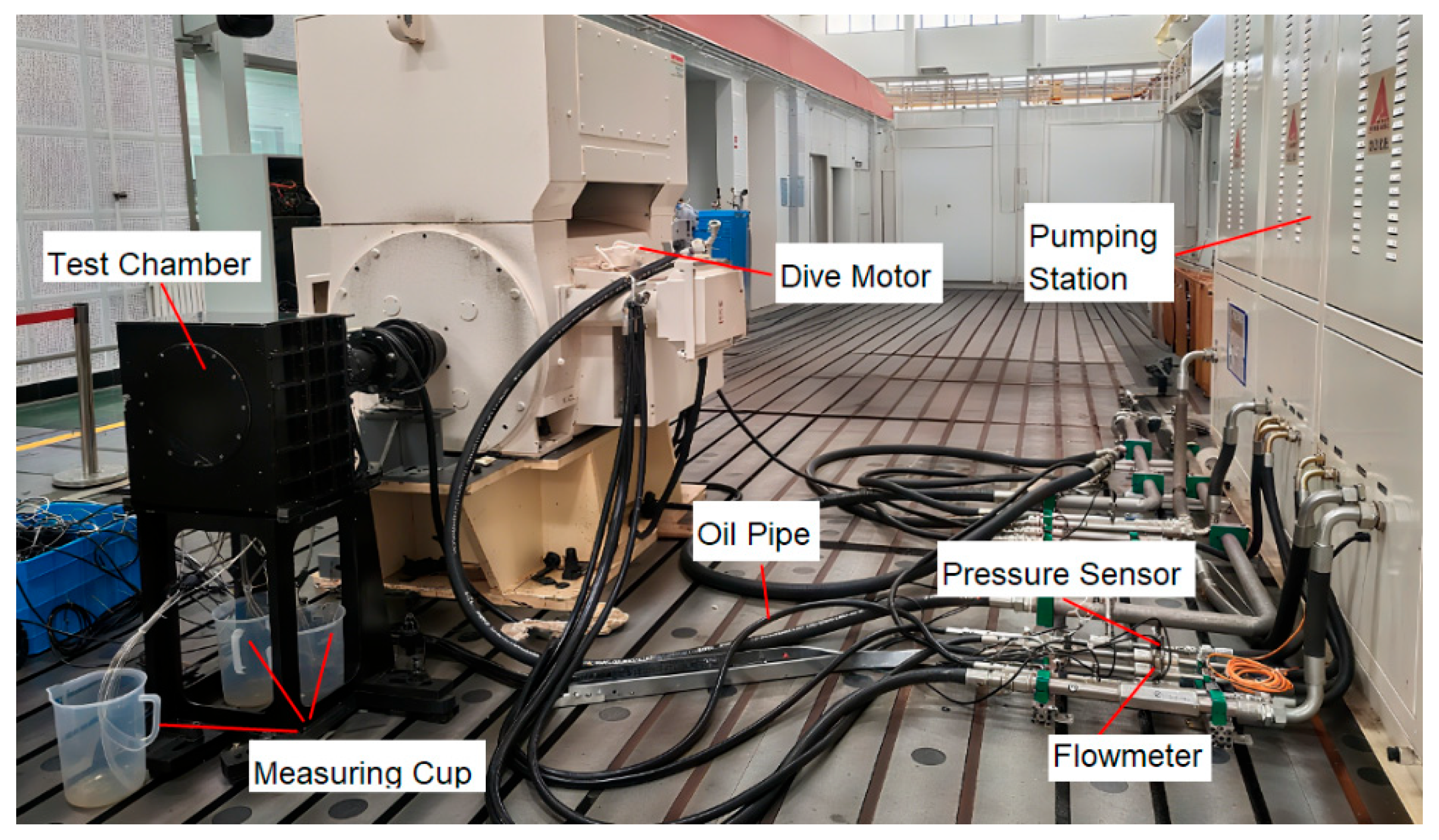 Figure 3. For each oil pressure and rotational speed condition, data are acquired over a 20 s interval, with each measurement repeated three times. After data recording, the oil from the measuring cups is returned to the pump reservoir, and this procedure is repeated until all experimental conditions are tested. As shown in