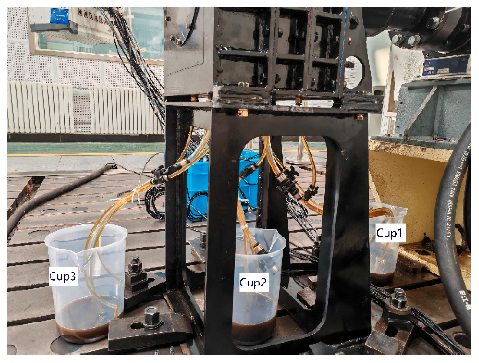 The experimental procedure is described as follows: first, the drive motor is activated, and the main shaft begins to rotate. The first-stage planetary carrier remains stationary at 0 rpm, while the second- and third-stage carriers rotate at the same speed as the main shaft. The oil pump is then engaged to circulate lubricant through all planetary stages. Following a 20 s operational period of the drive motor, the test bench underwent oil supply cessation and system shutdown. Oil flow was subsequently collected over a 10 min interval until the volume in the measuring cups stabilized, indicating the attainment of steady-state conditions. After the oil flow reaches a steady state, the discharged lubricant is collected via three measuring cups (called Cup 1, Cup 2, and Cup 3, respectively) connected to the outlet ports at the bottom of the three compartments, as shown in