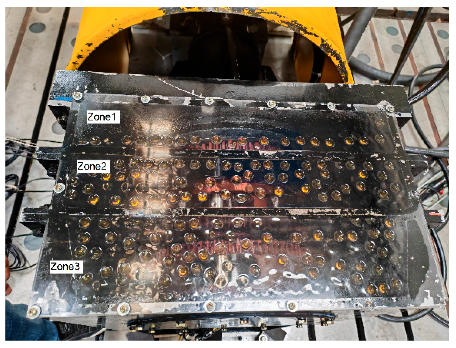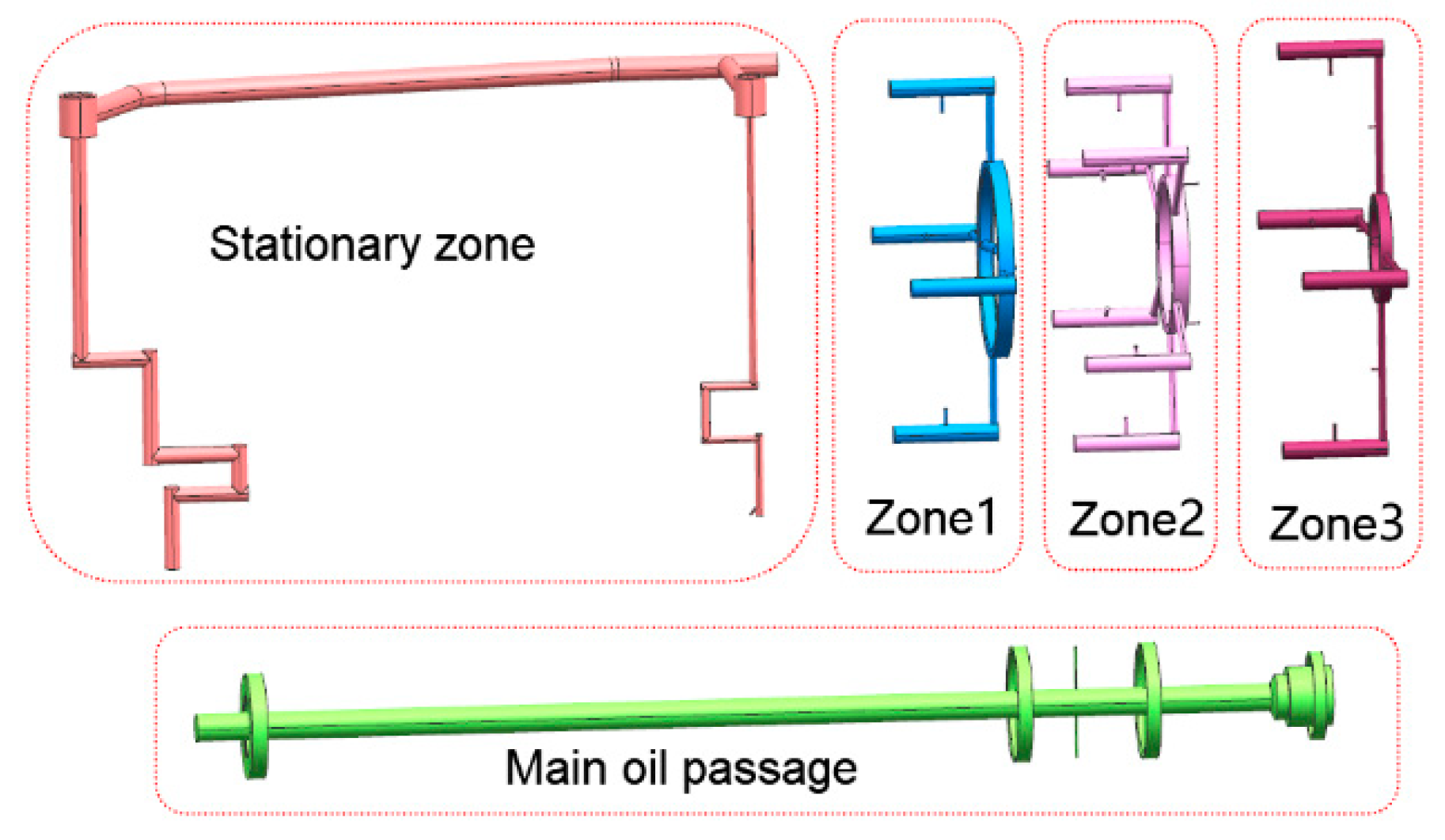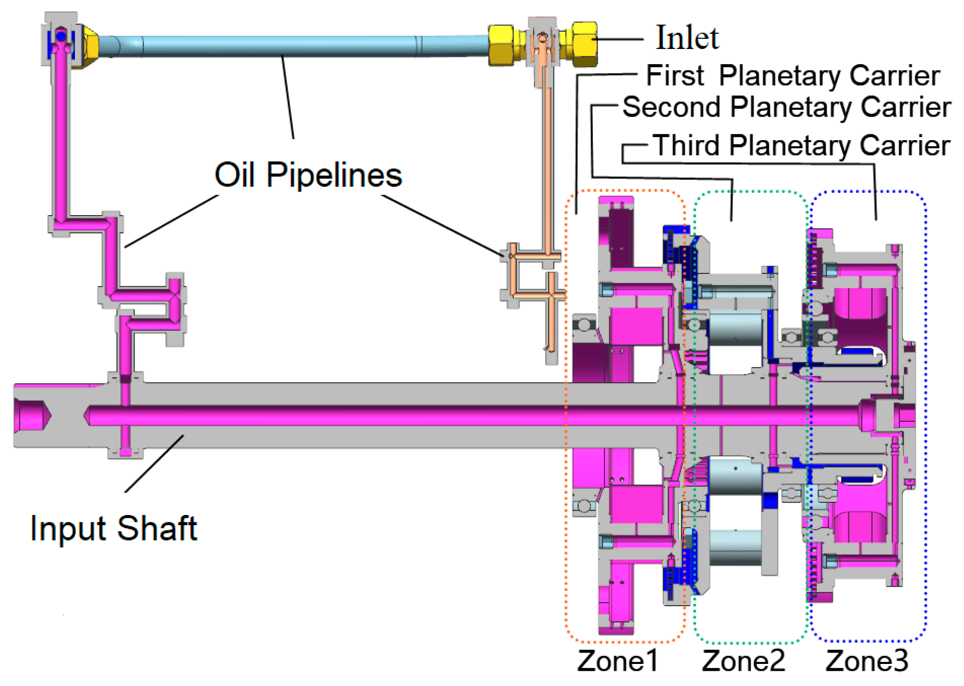 Figure 4, three compartments can be seen and are called Zone 1, Zone 2, and Zone 3, corresponding to the first, second, and third-stage planetary gear set, respectively. Oil splashing behavior resulting from planetary gear rotation can be observed through a transparent window mounted on the top cover.