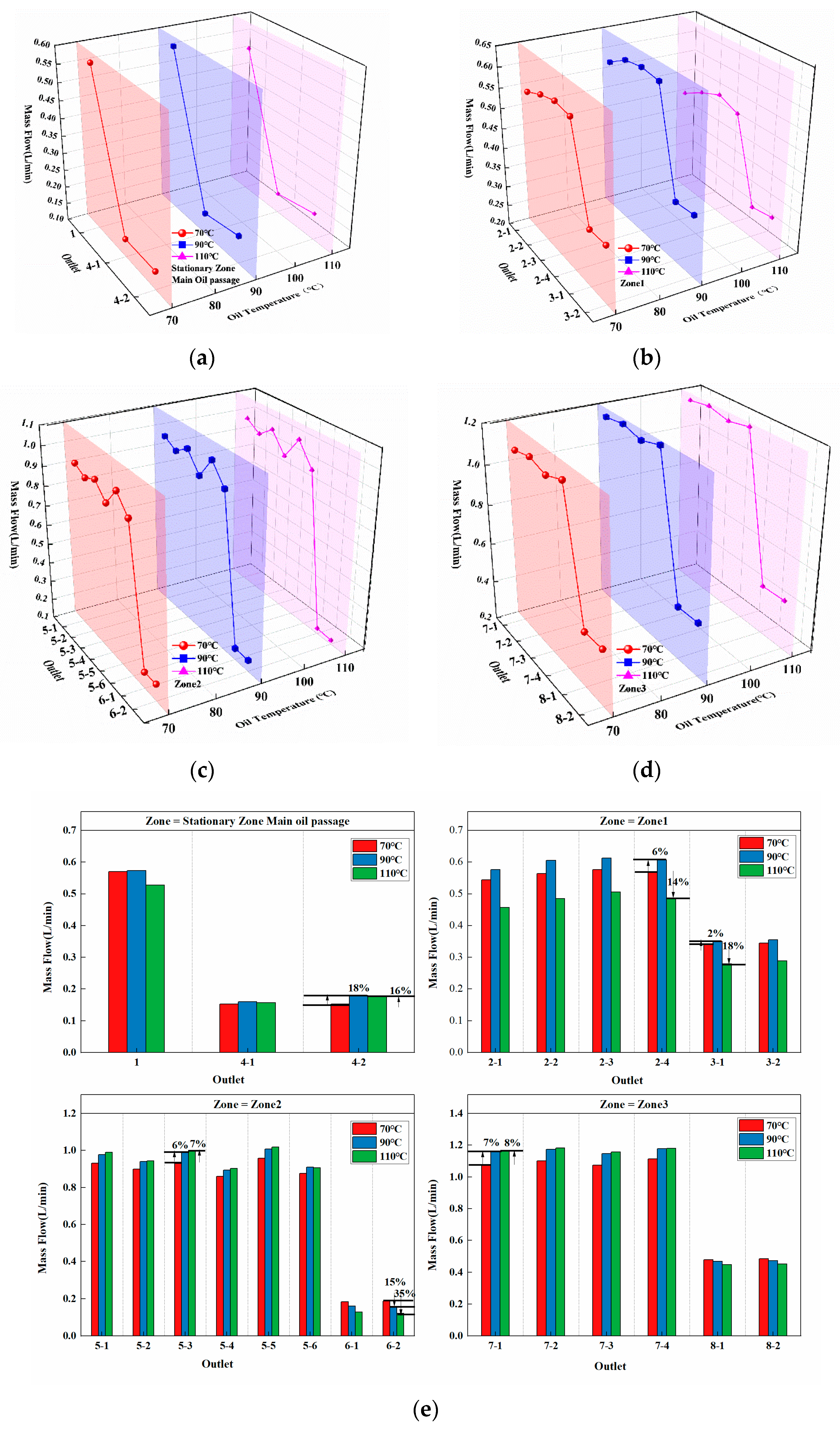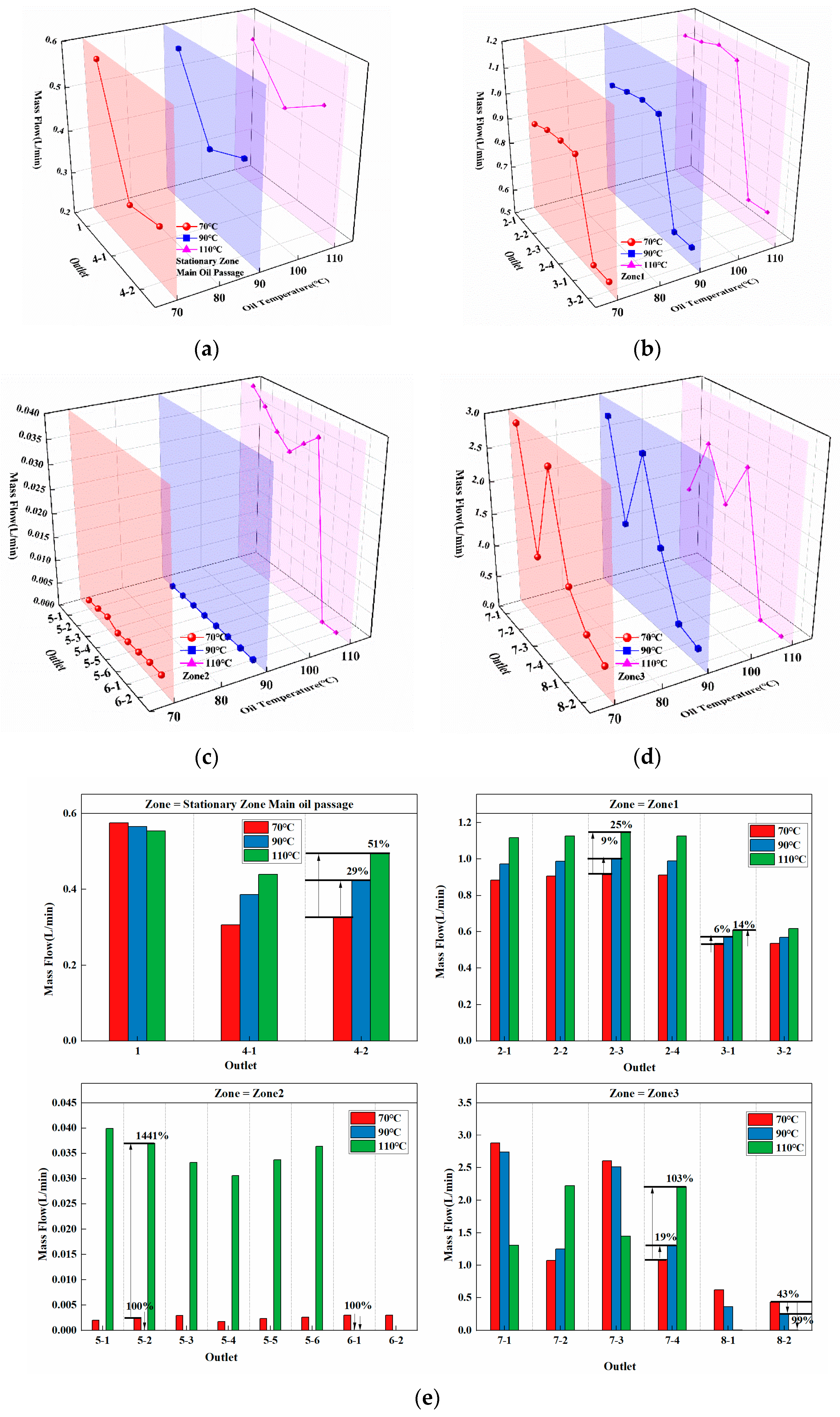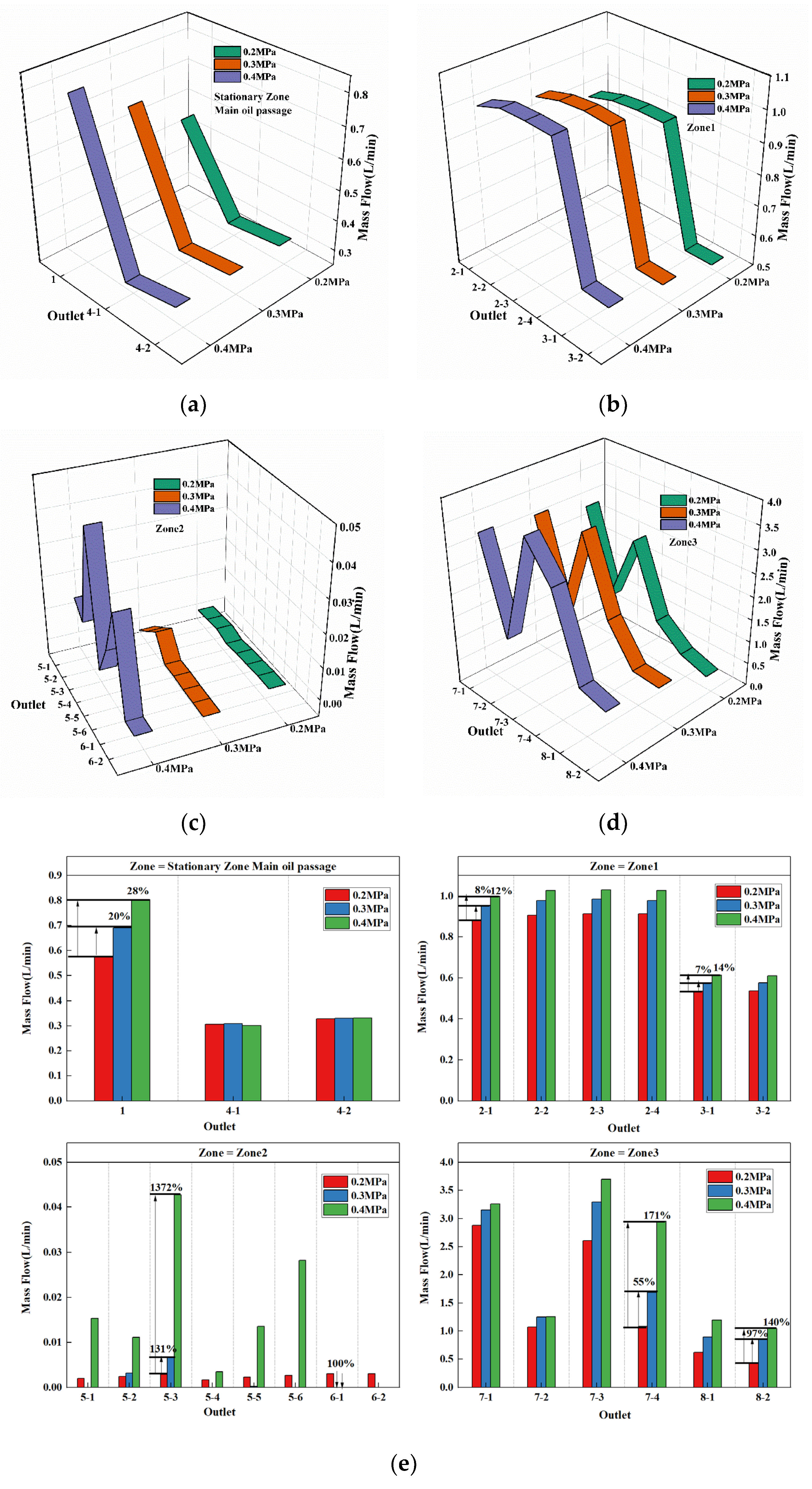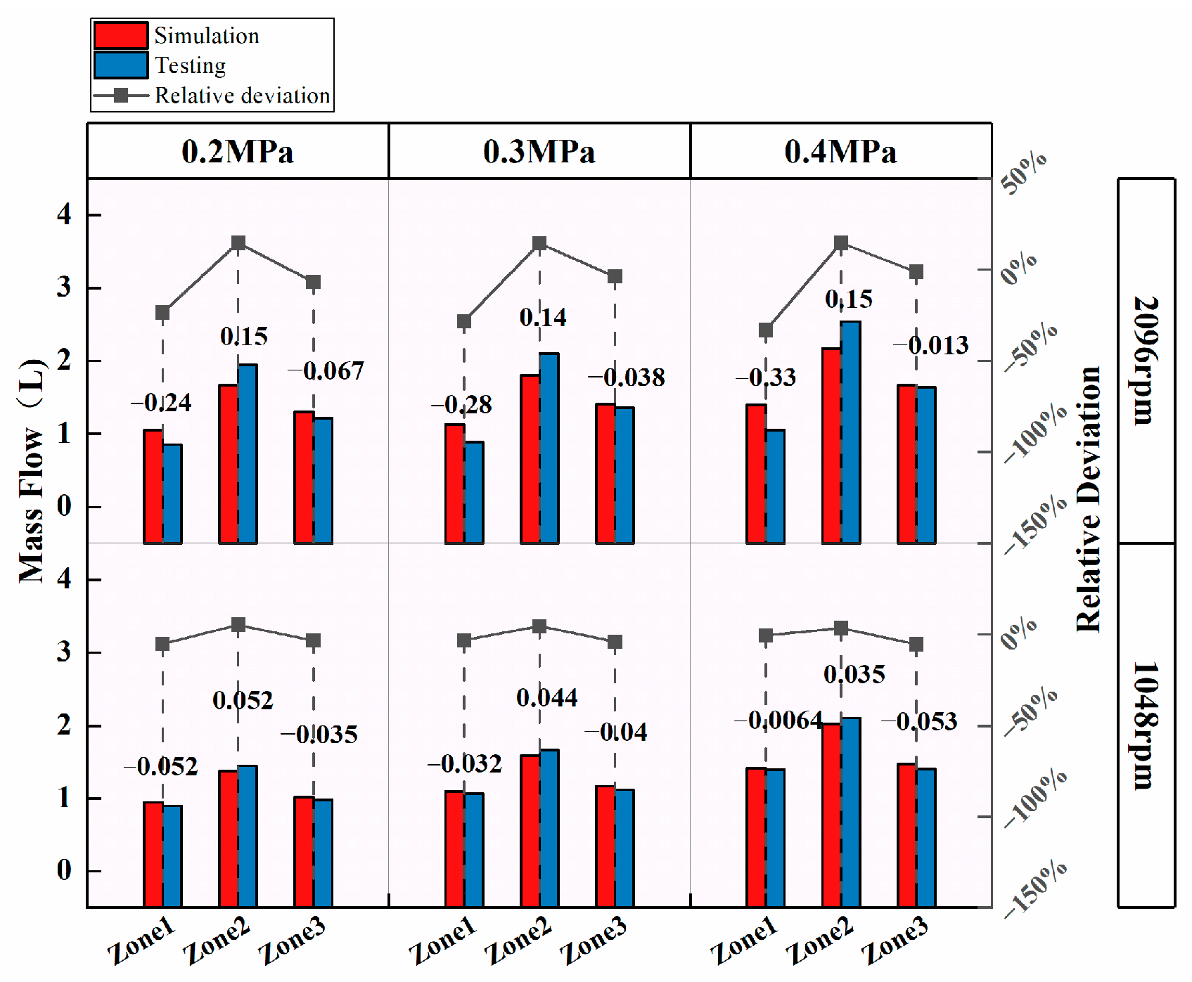 Figure 6. As shown in the figures, the simulation results are in good agreement with the experimental data. At 1048 rpm, the maximum observed deviation is 5.3%. At 2096 rpm, larger deviations are observed in Zone 1 and Zone 2, with maximum errors of 33.2% and 14.7%, respectively, and Zone 3 shows a maximum error of 6.8%. This phenomenon can be attributed to the increased centrifugal force resulting from the higher rotational speed and oil pressure, which enhances the oil discharge in Zone 2 and reduces the outflow in Zone 1. Despite these discrepancies, the relative errors remain within an acceptable range for engineering applications; therefore, the proposed numerical methods can be considered suitable for analyzing the lubrication behavior of multi-stage planetary transmission systems under a wide range of operating conditions.