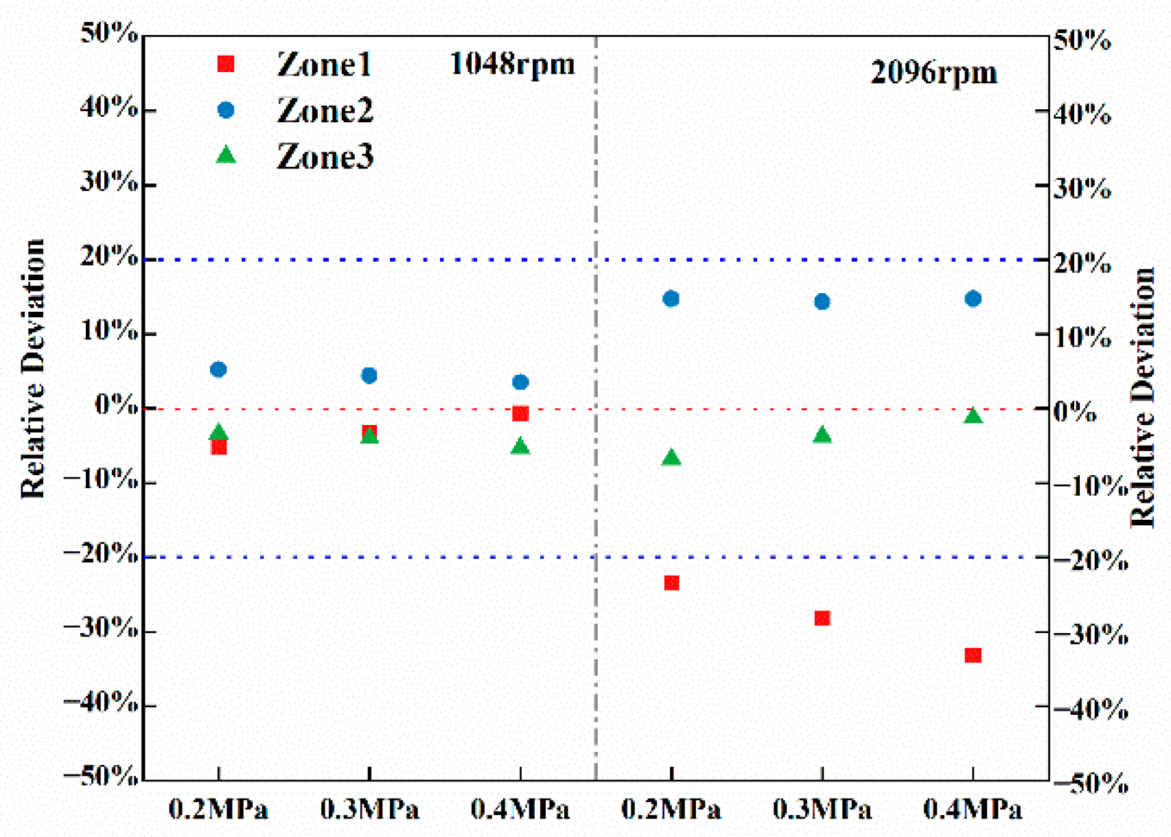 The proposed numerical methods are validated by comparing the simulated oil discharge volumes from each planetary stage with the corresponding experimental measurements. The experiments are conducted under inlet oil pressures of 0.2 MPa, 0.3 MPa, and 0.4 MPa at drive speeds of 1048 rpm and 2096 rpm. The relative deviations of oil volumes between experimental and simulated results are calculated, as illustrated in