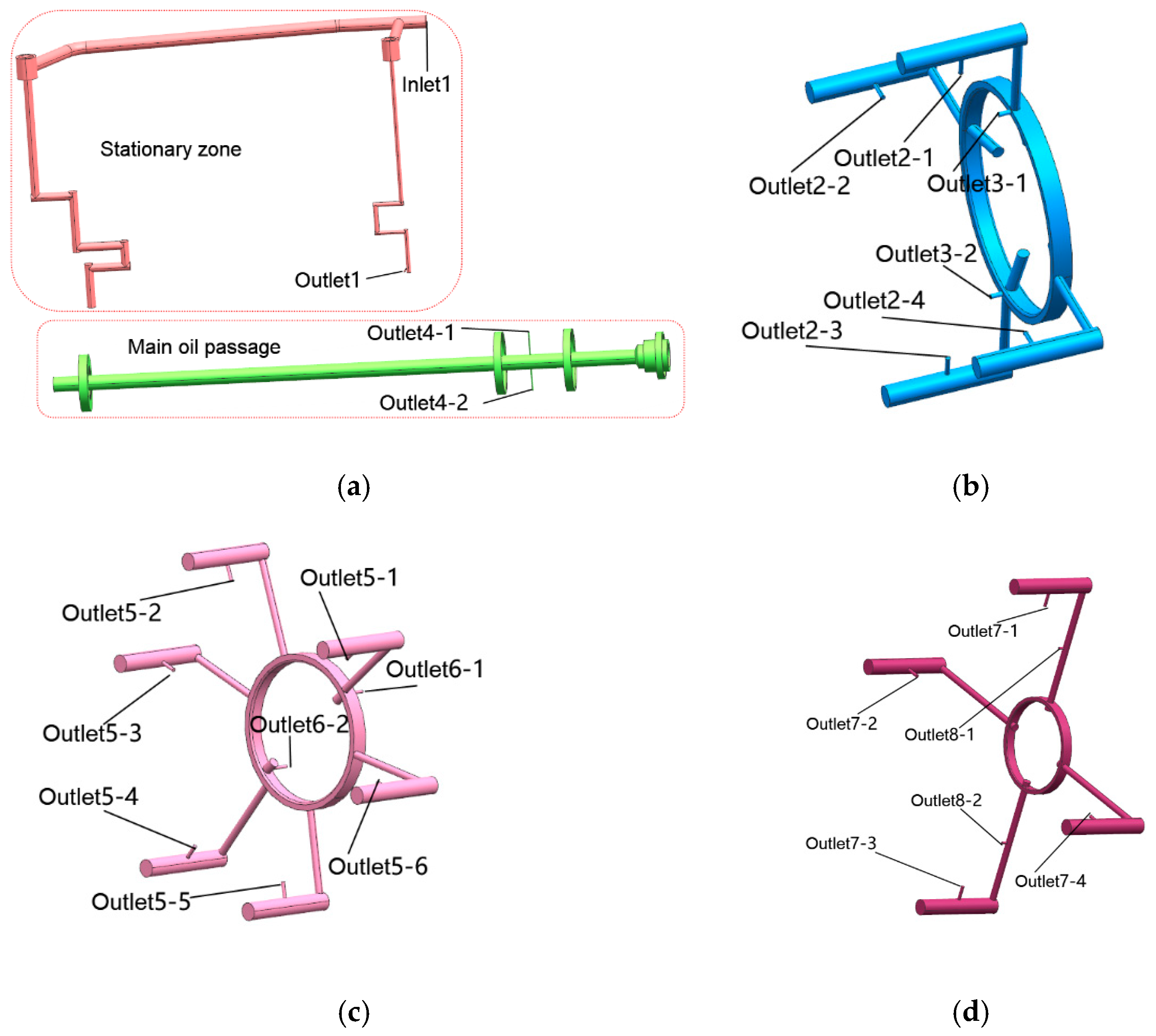 In this work, the flow of lubricating oil in the oil passages is categorized as viscous flow. Its flow state typically involves pipeline losses due to frictional resistance and variations in pipe diameter. For the simplification and analysis of the lubricating oil passage, it satisfies the Bernoulli equation [