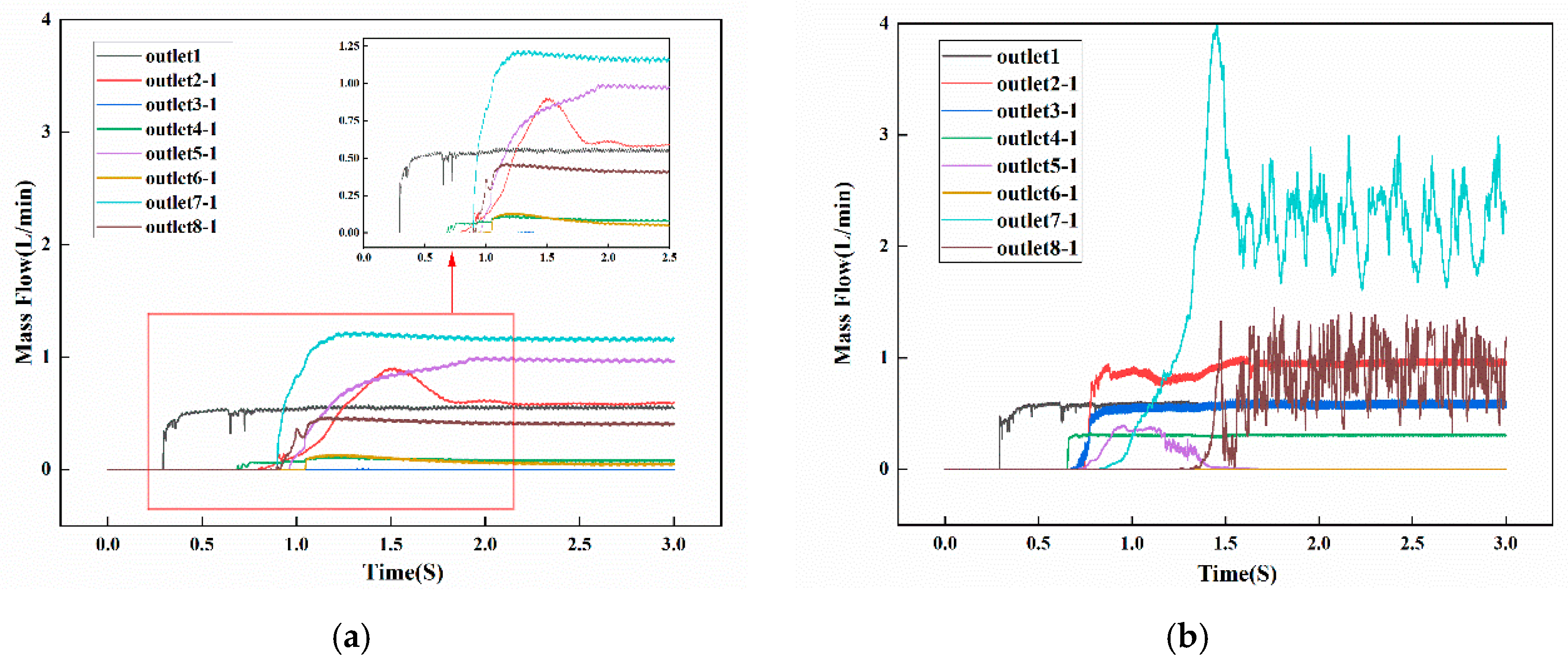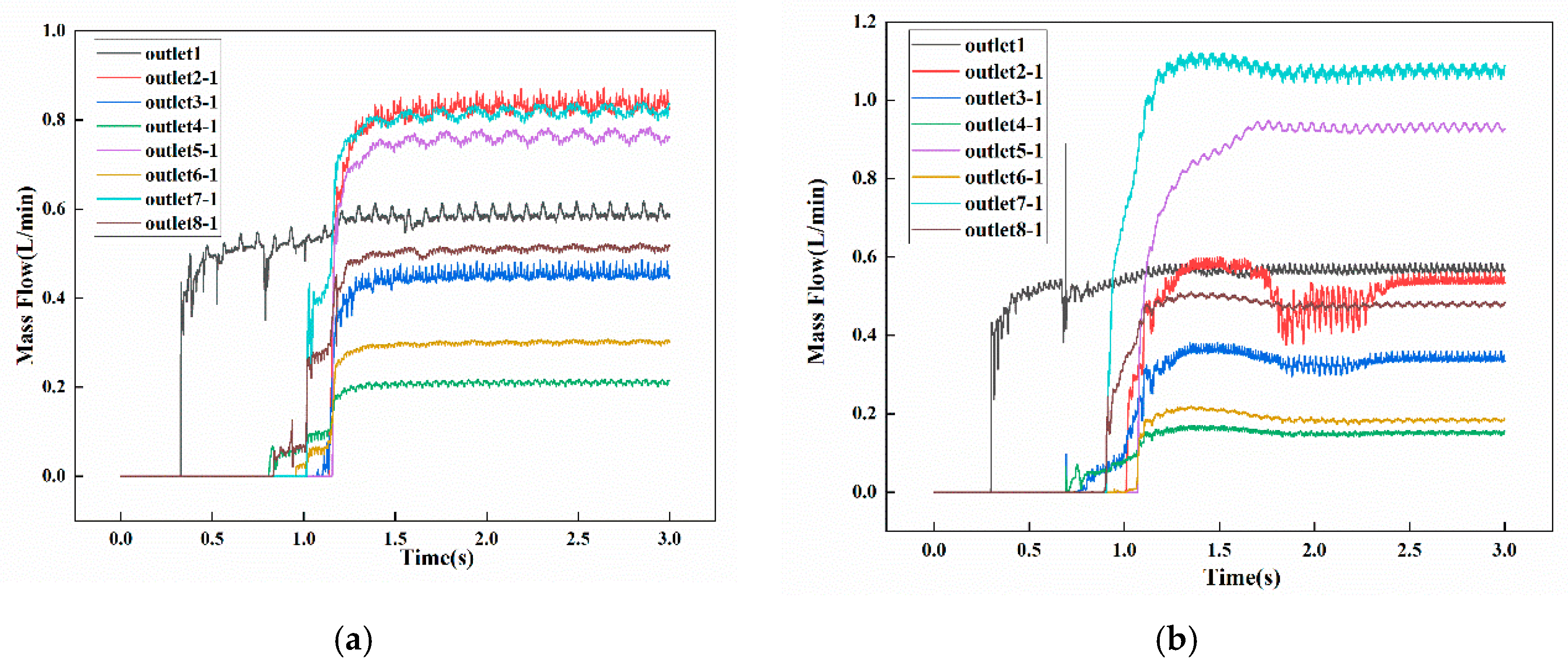 To compare the numerical results with experimental ones, first, a grid independence study was conducted to ensure that the computational results were unaffected by mesh discretization, thereby enhancing simulation reliability. Three mesh sizes—0.8 mm, 1.2 mm, and 1.6 mm—were evaluated by comparing the deviation between the inlet and total outlet flow rates. As the mesh was refined, this deviation decreased, with the relative error falling below 0.2%. Considering both computational accuracy and cost, a mesh size of 1.2 mm was selected as the optimal configuration. The grid independence analysis data are presented in