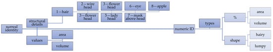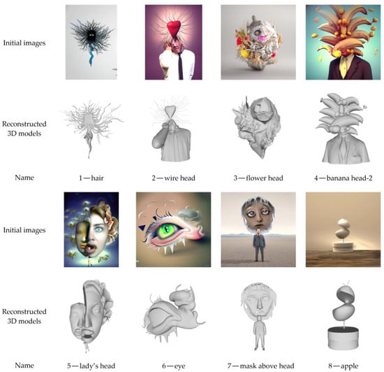 Eight types of configurations (Figure 3) were selected from nearly 100 AI-generated surreal images and assessed in terms of structural details, from modified values of area and volume. The reconstructed 3D models exhibited the detailed and explicit 3D spatial structure, such as the basic configurations, referencing shapes, and composition context. Three types of 3D models were classified by the long and thin linear (1—hair in Figure 3), convex (8—apple in Figure 3), and concave (7—mask above head in Figure 3) shapes. Each surreal 3D model reveals the number and the distribution of linear and volumetric elements. The level of detail and the complexity are significantly contributed to by the general perception of the diameter, curvature, and length of a linear element. The context varied from the evenly or partially distributed pattern to the differentiated allocation of linear and convex–concave elements.