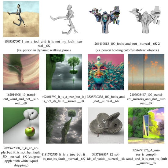 A total of eighty-seven prompts were utilized in Dream Studio®, eight in Stable Diffusion®, and six in Rodin® (Figure 5). A few images were selected from among the quadra-based outputs of Dream Studio®. About 100 outputs were generated in Stable Diffusion® txt2img-images, and 24 were generated in txt2img-grids. This is to test if the conflicting prompts will generate surreal images even using different AI software platforms, such as Dream Studio®, Stable Diffusion®, and Rodin®. The results were positive.