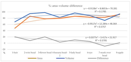The differences between original volume/area and modified volume/area are determined by the following. (1) Ratios: when volume is less than surface area (Relax), it is highly detailed; (2) reduction speed: volume vs. surface area vs. dist./deviation; (3) feature types with relax/Quicksmooth/reduce noise/remove spike; (4) std. deviation % involves max. distance and avg. distance in terms of the 1—hair and 8—apple models.