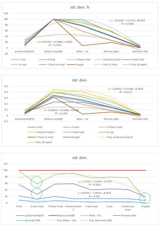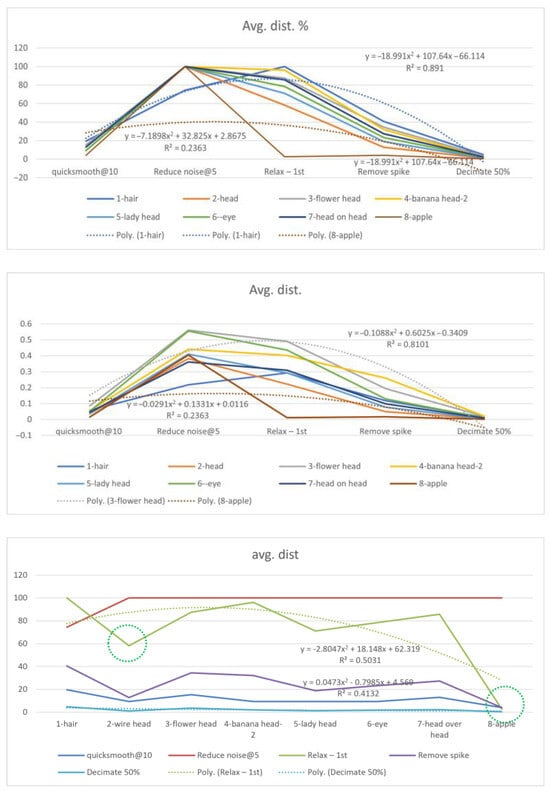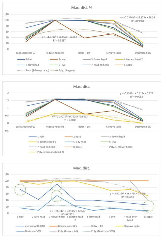 - Relative values—2: In general, the “reduce noise” de-featuring function resulted in the largest difference made to the original shape, in terms of standard deviation, maximum distance, and average distance. By assigning the highest one to 100% as the maximum reference value, all the defeatured versions of each test model were transferred into charts. In general, the closer the relative value to is 100%, the larger the deviation. This was usually the case when most details were smoothed out or disappeared.The equation is (C/D) × 100, in which (1) “C” represents the standard deviation, maximum distance, and average distance modified by a specific function, such as Quicksmooth@10; (2) “D” represents the highest standard deviation, maximum distance, and average distance to the original model among all modified results; and (3) is the value of 100%.