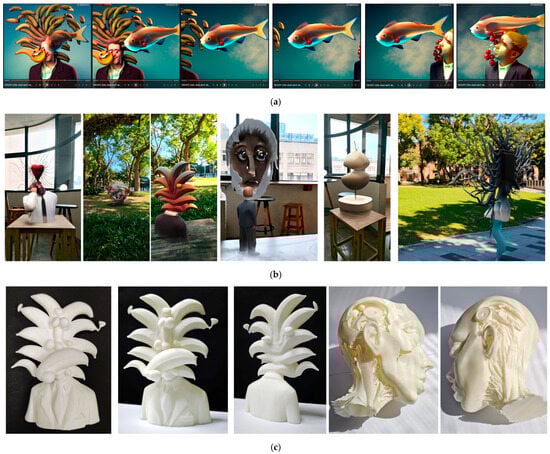 In image-to-3D generation, the number of allowed views or images is between 1 and 4. Since each surreal image was unique, only one image was used to create a 3D mesh. The higher the image resolution, the better the details within the maximum polygon count of 1,000,000 in the applied program of Rodin®. Image resolution in this study was 512 × 512 at 96 dpi (lady’s head) and above. The 3D reconstruction did not generate models at a 100% resemblance level, since the missing information on the back of a subject had to be created by using the configuration and texture of the front. Each model was repeatedly adjusted for a maximum of 20 trials. Each trial will generate a 3D model to simulate the provided image, with slight differences in outline, allocation of parts, or the size of the body. It was the author who determined and selected the one with the best resemblance.