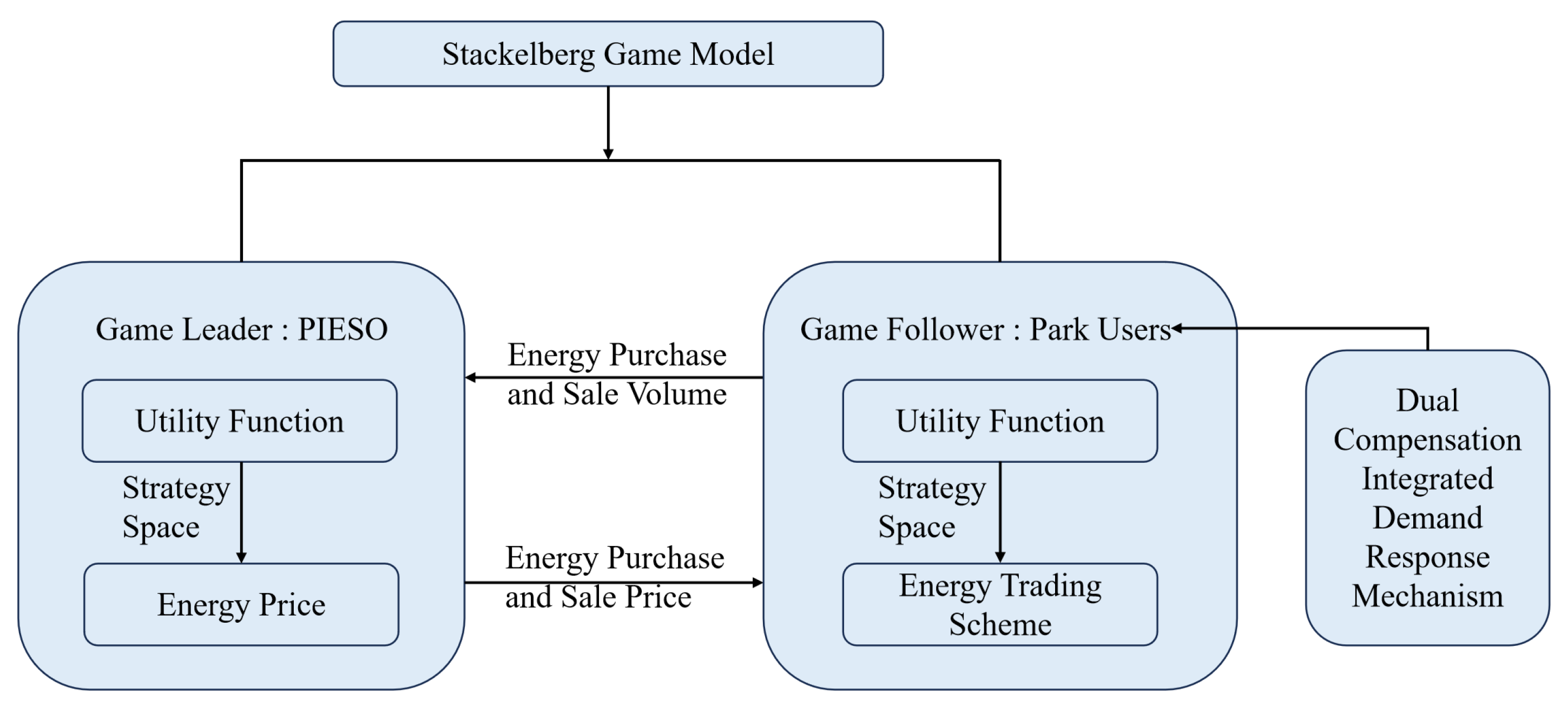 Under the power market transaction framework, the PIESO and park users, as market entities with independent decision-making power, form a typical two-way interaction relationship. This interaction has the following characteristics: first, there is a temporal and spatial asynchrony in the decision-making behavior of both parties. The PIESO, as the price setter, issues energy pricing strategies, and park users then adjust their energy usage strategies based on price signals. Second, the decision-making process exhibits a two-way influence: the PIESO’s pricing strategy directly affects users’ energy consumption costs, while users’ load response, in turn, impacts the PIESO’s income level. Third, an asymmetric game relationship is formed between the two parties in the process of pursuing their respective maximum interests. These characteristics fully conform to the theoretical framework of a Stackelberg game. The specific energy transaction framework is shown in Figure 1.