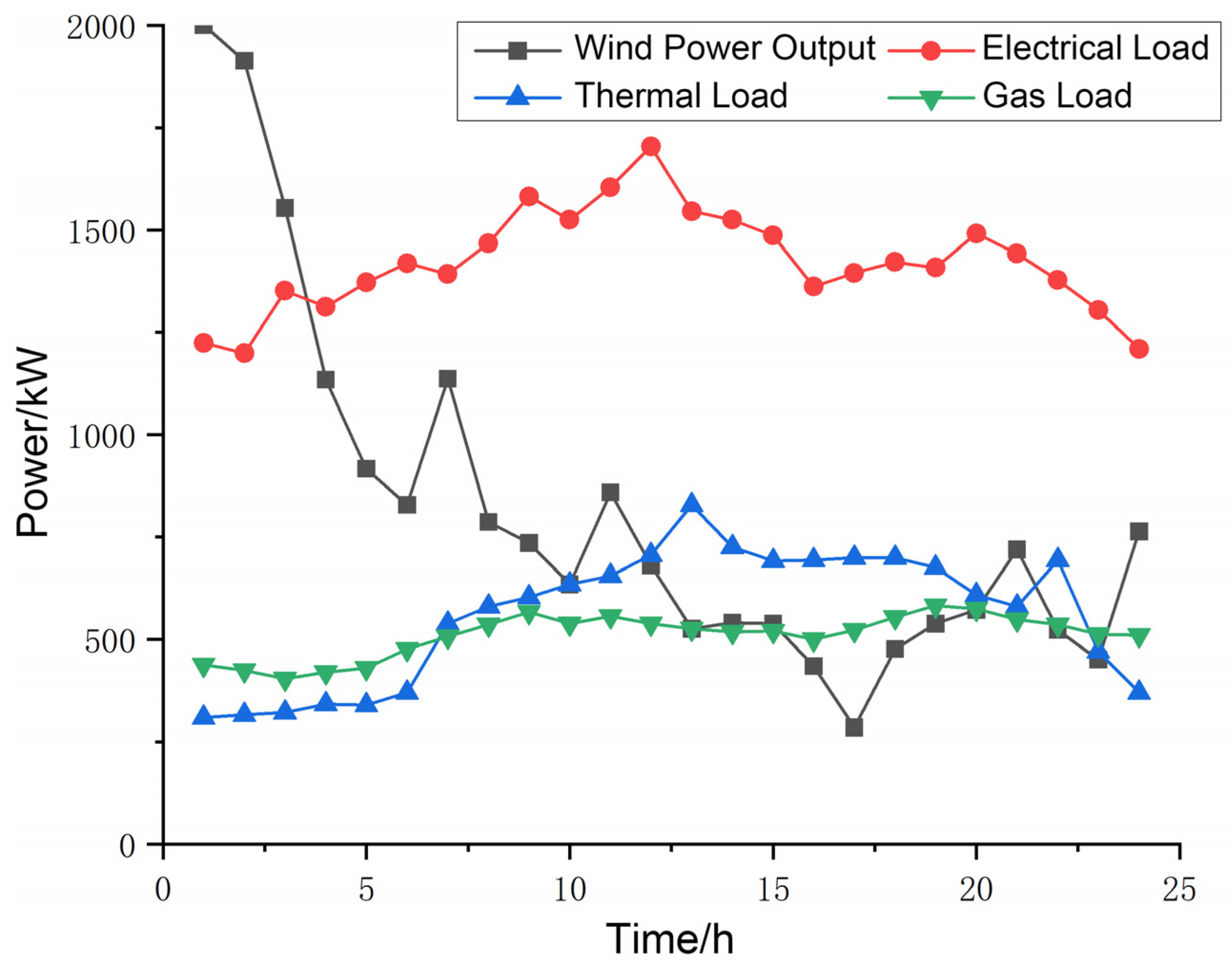 where , , and are the maximum values of the average electricity, heat, and gas prices, respectively, in the whole dispatching cycle; and and are the upper and lower limits, respectively, of the dynamic electricity price.