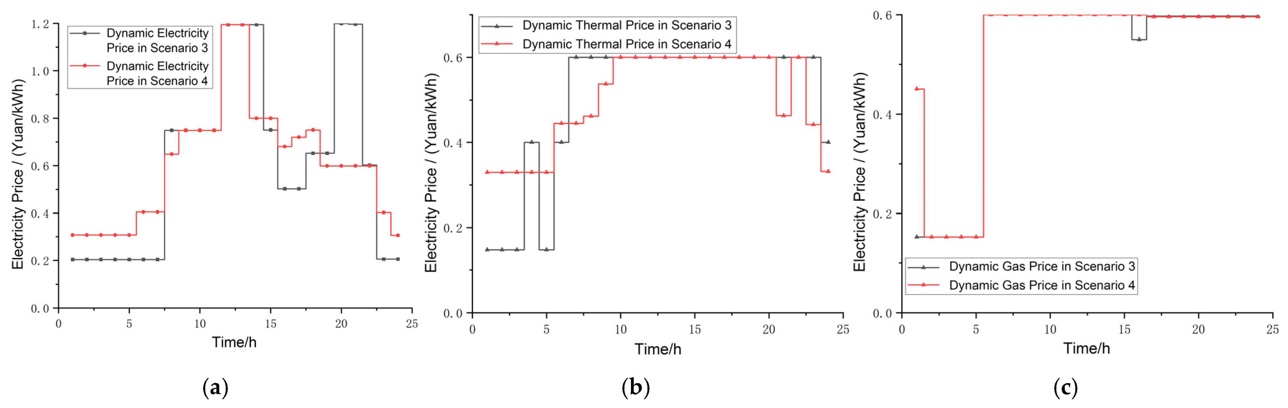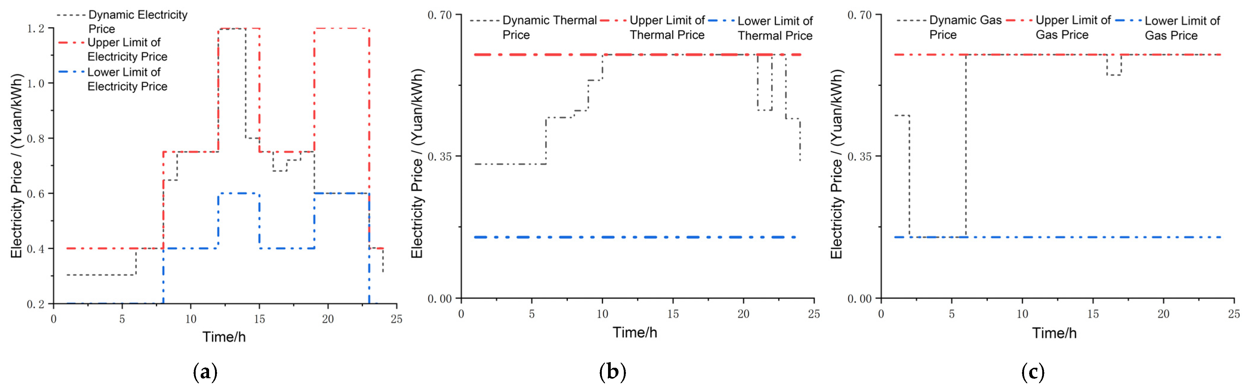 Dynamic electricity/heat/gas prices formulated by the PIESO. (a) Electricity. (b) Heat. (c) Gas.