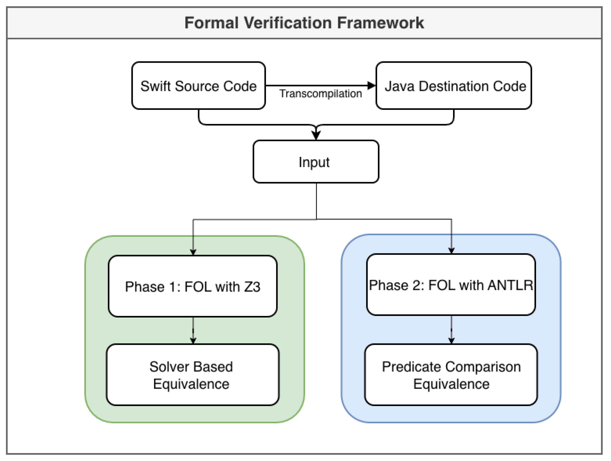 - Applies Z3-based equivalence checking using manually encoded FOL representations of Swift and Java code.